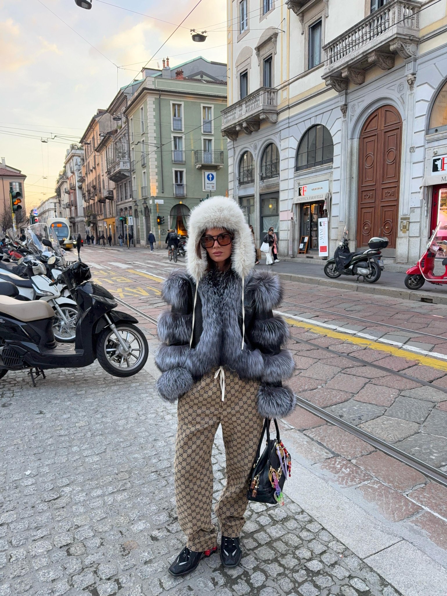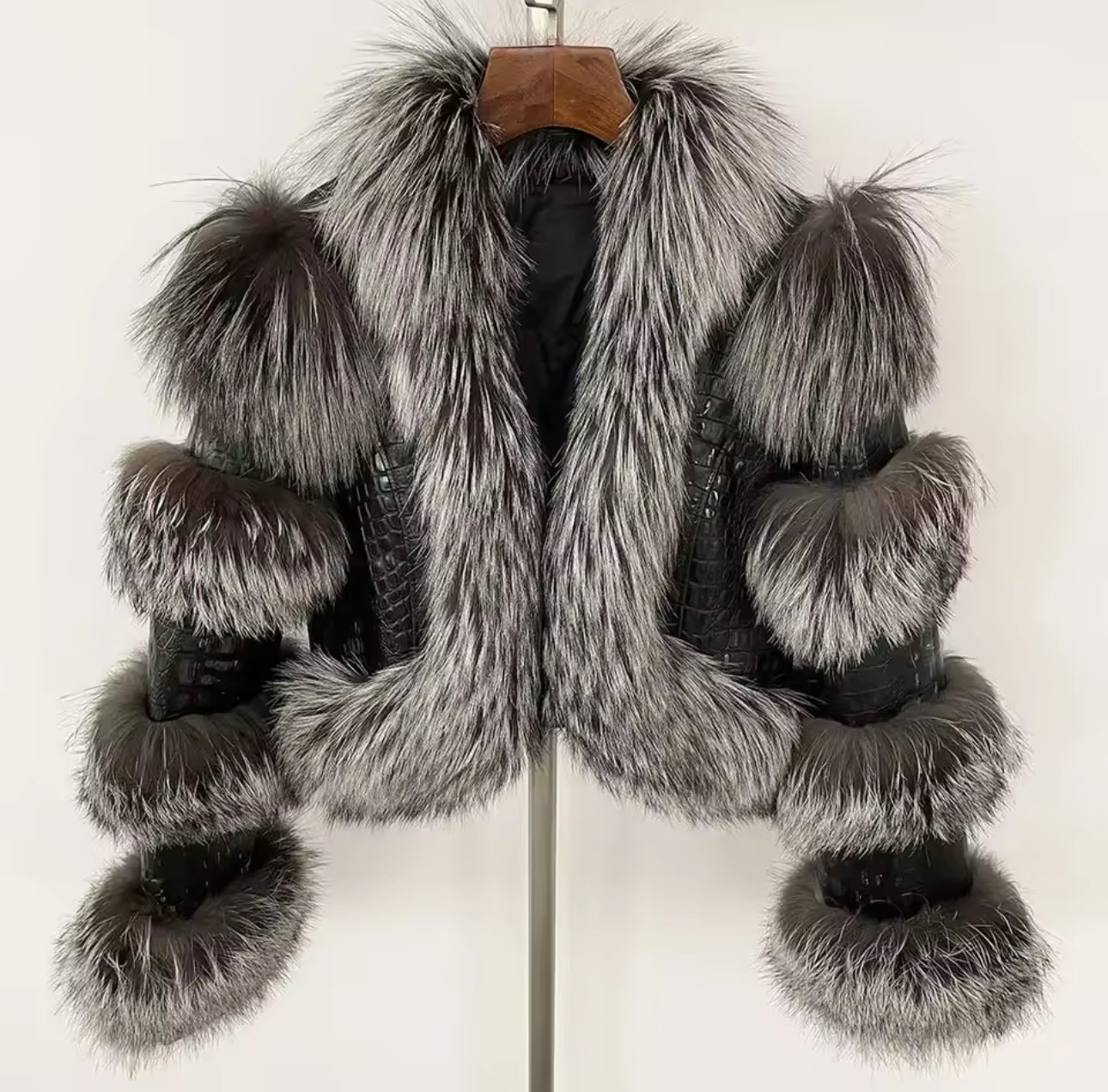 El Chaquetón Charlotte combina cuero trabajado, con Pelo Natural en tonos grisáceos.